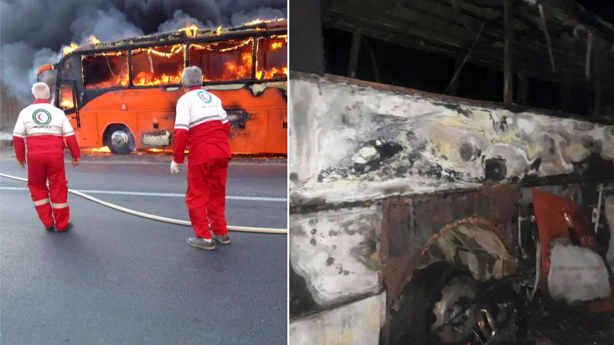 آتش سوزی اتوبوس ولوو با ۳۰ مسافر در محور هراز + فیلم