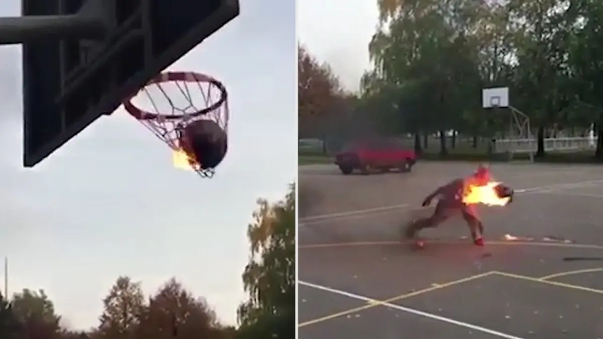 وی در جدیدترین اقدام جالب توجه خود، توپ بسکتبال را آتش زده و در حالی که این توپ زیر دستانش شعله ور هستند، دریبل کرده و سپس اسلم دانک می کند.