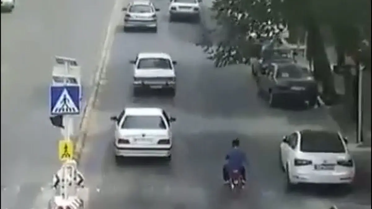 رکنا: تصاویری از خوش شانسی موتورسوار را مشاهده میکنید که از سقوط تیر برق جان سالم به در برد.