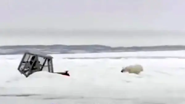 رکنا: لحظه ای هراسناک که فیلمبردار با خرس قطبی 1000 کیلویی که به دنبال وعده غذایی خود است چشم در چشم می شود. شکارچی با قد 2.5 متر مکررا به محل اقامت او یورش می برد.
