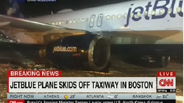 به نقل از شبکه تلویزیونی سی ان ان، یک فروند هواپیمای مسافربری در باند فرودگاه لوگان در بوستون آمریکا بر اثر لغزش روی یخ، چند بار دور خود چرخید. این هواپیمای مسافربری، که متعلق به شرکت هواپیمایی «جت بلو» بود، در شرایط برف و یخبندان در فرودگاه لوگان فرود آمد، ولی ناگهان روی باند فرودگاه لغزید و دور خود چرخید.