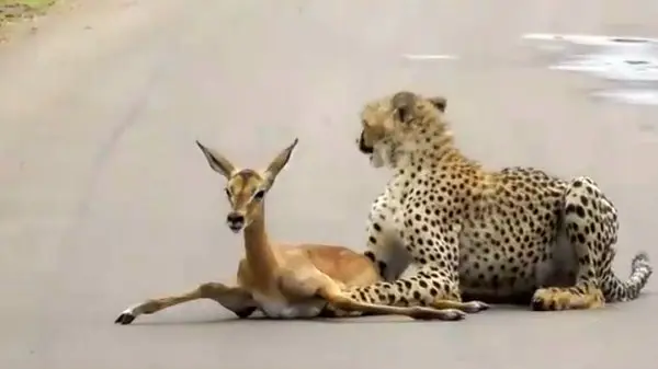 شکار عجیب بچه آهو توسط چیتای جوان وسط یک جاده آسفالته + فیلم و عکس