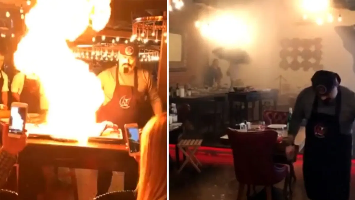 رکنا: سرآشپزی که در یک رستوران قصد هنرنمایی حین طبخ غذا مقابل مشتریان را داشت، به خاطر اقدامی نسنجیده بسیار خجالت زده شد.