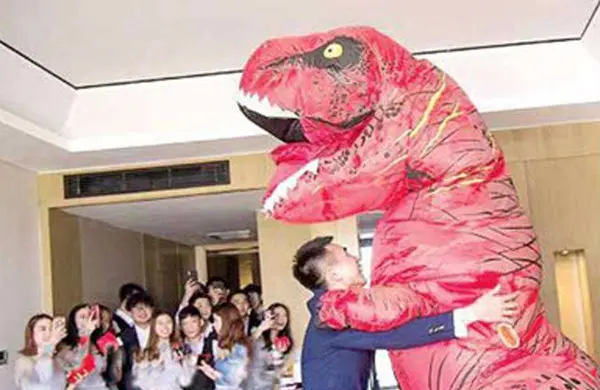 حوادث رکنا: عروس چینی در روز ازدواج با پوشیدن لباس دایناسور، داماد را غافلگیر و شوکه کرد.