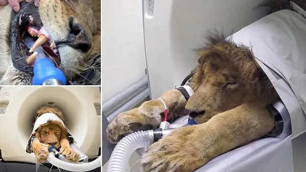 تصاویر منتشر شده از درمان این حیوان نشان میدهد که دامپزشکان برای برطرف کردن بیماری این حیوان پس از بیهوشی شیر را سی تی اسکن کرده و از تکنولوژی های بالای روز استفاده می کنند.