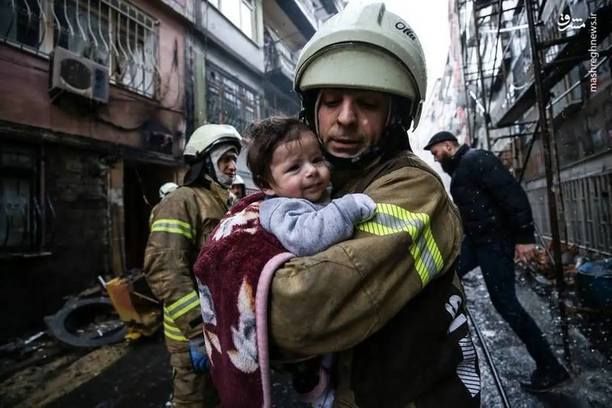رکنا:یک آتش نشان نوزادی را از محل انفجار گاز در منطقه فاتح استانبول دور میکند.