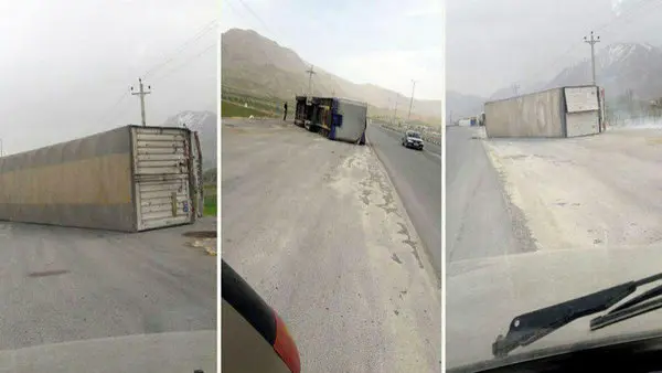 باد شدید در جاده ماکو تریلی های کانتینردار را چپ کرد + عکس