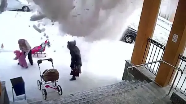 دو زن و یک کودک روبروی منزلی در یکی از شهرهای روسیه مشغول به صحبت بودند که ناگهان برف روی شیروانی، بر روی سر آنها فرود آمد.