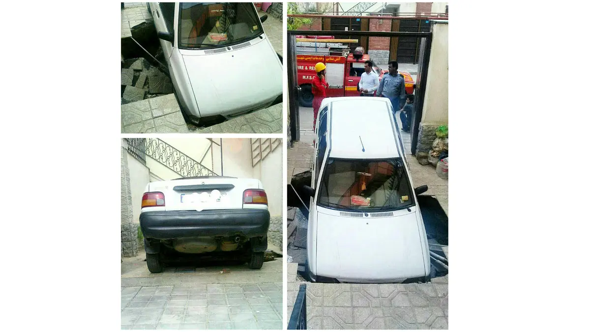 خیلی زود تیم های امدادی در محل حاضر شدند و مشاهده کردند خودروی پرایدی داخل حفره بزرگی که در کف حیاط ایجاد شده بود فرو رفته است.