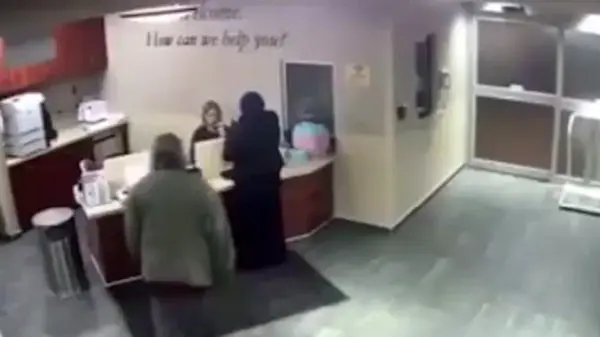 دختر جوان که پشت میز پذیرش بیمارستان بومونت در دیربورن مشغول صحبت با مسئول پذیرش بود با ضربه های ناگهانی مرد مهاجم دچار وحشت شد اما لحظاتی بعد مامور امنیتی بیمارستان به دادش رسید.
