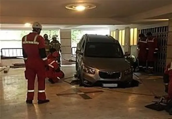 سقوط سانتافه در چاه ساختمانی در تهران + عکس