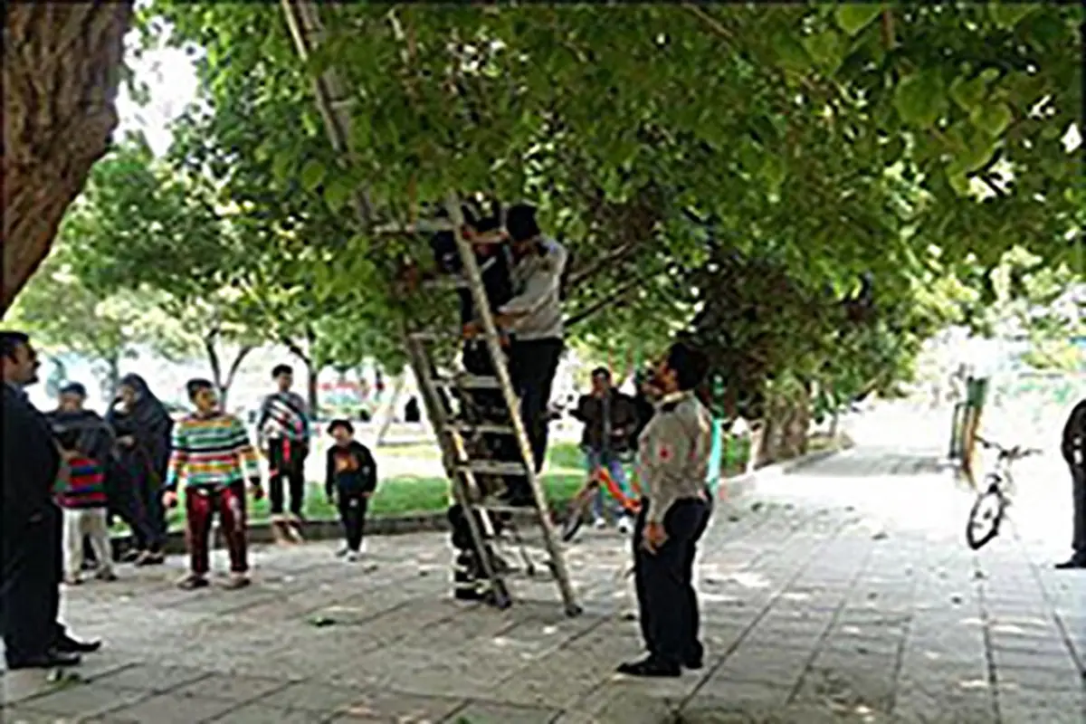 پسر بازیگوش در خانی آباد بالای درخت گیر افتاد + عکس