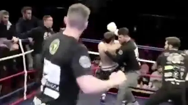 رکنا: حین برگزاری یک مسابقه بوکس در انگلیس چند هوادار بوکسور بازنده وارد رینگ شدند و با شیء فلزی به بوکسور پیروز حملهور شدند.