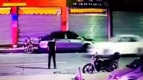یک جوان چینی در حاشیه یک خیابان ایستاده بود که به دلیل خواب آلودگی ، روی زمین افتاد. پس از این اتفاق، یک دستگاه خودروی سواری که مشغول به حرکت در آن خیابان بود، بدون توجه به حضور مرد جوان، از روی او رد شد.