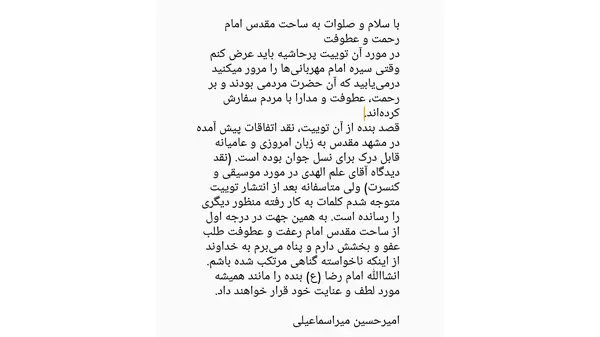پس از اینکه توییت وی با موجی از واکنشهای کاربران و اعتراض به این خبرنگار هتاک همراه شد و بسیاری خواستار ورود نهادهای ذیربط و برخورد قانونی با این فرد هتاک به ائمه معصومین (ع) شدند میراسماعیلی متنی را در صفحه توییتر خود منتشر و به دلیل این جسارت از کاربران عذرخواهی کرد.