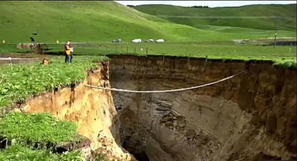 حوادث رکنا: بارش شدید باران در مناطق ساحلی شمال نیوزیلند، روز دوشنبه ۳۰ آوریل گودالی بزرگ به وسعت دو زمین فوتبال در داخل مزرعهای در نزدیکی خلیج پلنتی بوجود آورد.