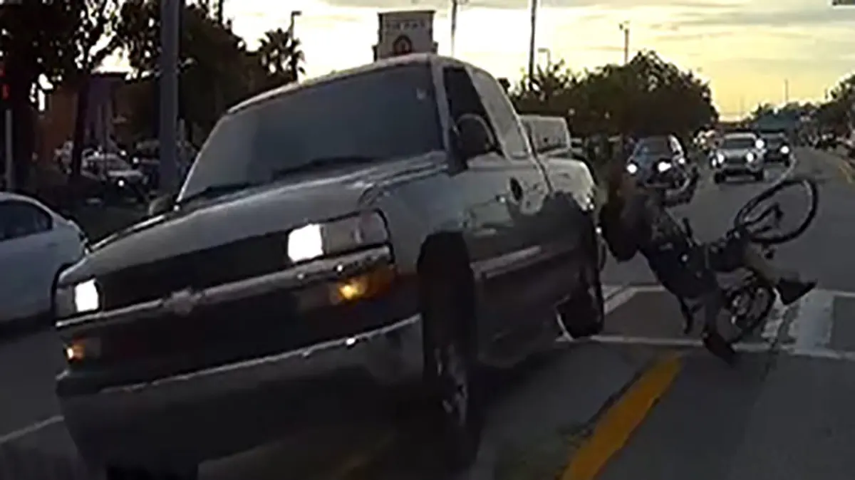 دوچرخه سواری که قصد داشت از عرض خیابانی در فلوریدای آمریکا عبور کند، پس از برخورد یک خودرو با او، راهی بیمارستان شد.