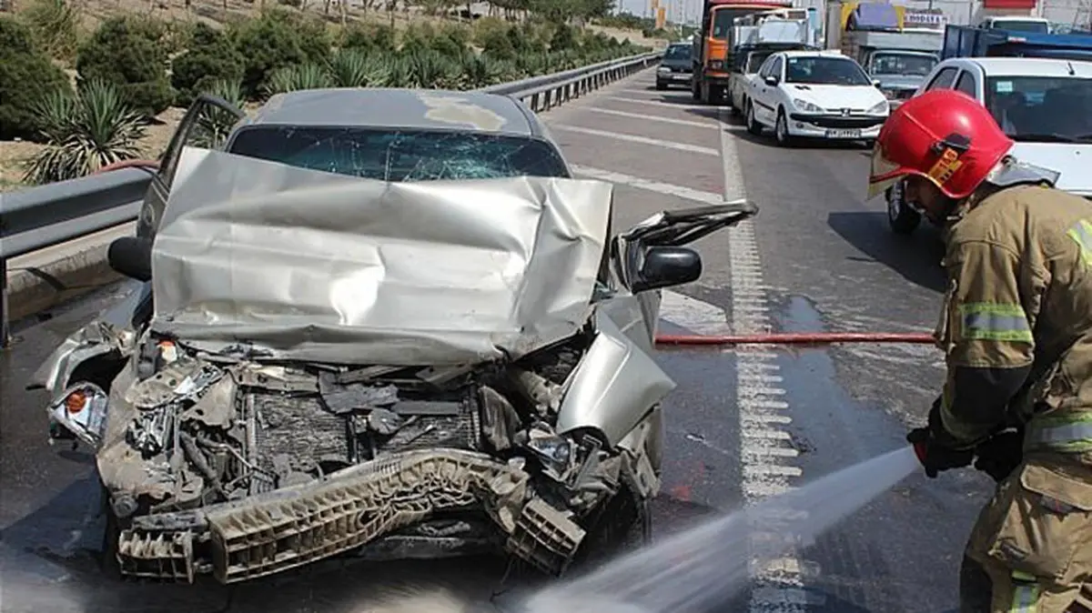 گرفتار شدن راننده در خودروی سواری له شده در آزادگان تهران + عکس