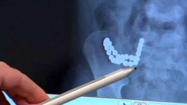 به گزارش گروه ترجمه رکنا، عکس رادیولوژی باور نکردنی از شکم این پسر 5 ساله، مگنتها را نشان میدهد که داخل شکم او در یک ردیف به هم چسبیدهاند. کودک با قورت دادن این آهنرباها آنها را آبنبات پنداشته بود جان خود را به خطر انداخته و از درد به خود میپیچید.