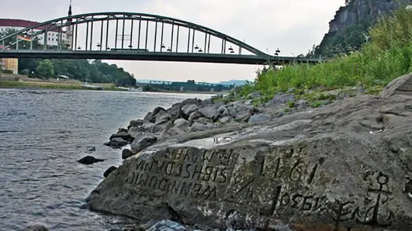 قدیمیترین سنگی که به تازگی از آب رود البه بیرون زده است به قرن هفدهم و سال 1616 مربوط میشود؛ بر روی این سنگ به زبان آلمانی نوشته شده که «اگر مرا میبینید، گریه کنید».