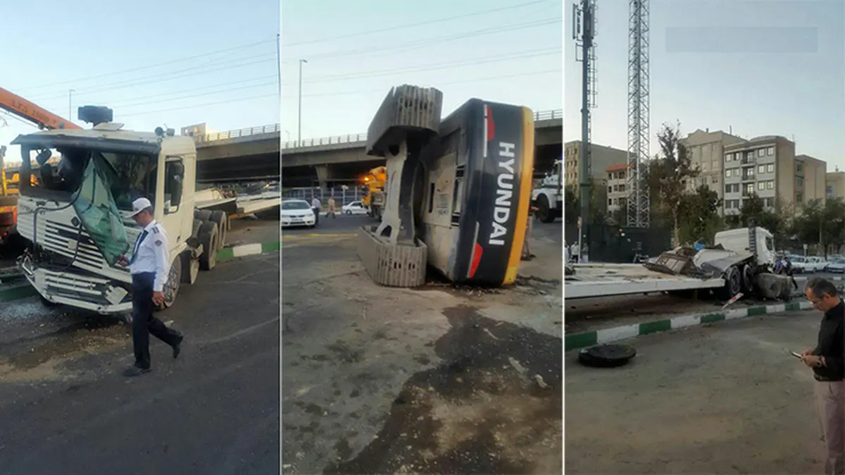واژگونی تریلر حامل بیل مکانیکی در تهرانپارس + عکس
