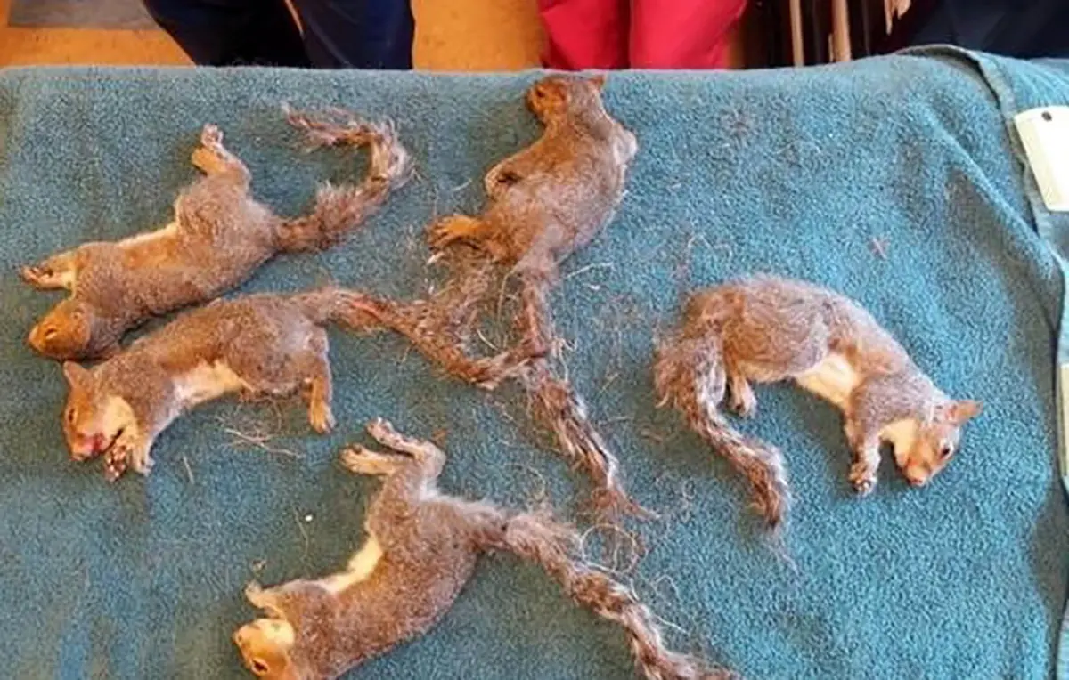 دم این پنج سنجاب خاکستری، توسط الیاف پلاستیکی و ساقه گیاهانی که مادرشان برای ساخت لانه مورد استفاده قرار داده بود با گرههایی کور به هم متصل شده بود. این سنجابها که امکان حرکت نداشتند نهایتا یا با تلاش بسیار برای جدا شدن از یکدیگر، دمهایشان را یکی از ابزارهای اصلی برای حرکت و گرمشدنشان است از دست میدادند و یا در صورتی که نمیتوانستند از هم جدا شوند در کنار هم تلف میشدند.