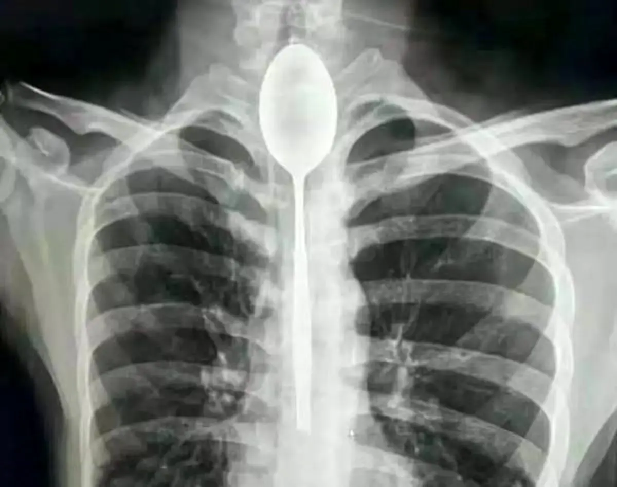 مردی که نامش فاش نشده است از منطقه جین جیانگ چین به پزشکان گفت :او یک قاشق فولادی ضد زنگ را در طی یک شرط درحالت مستی بلعیده . او به دوستانش گفته که می تواند قاشق را ببلعد و بعد دوباره با ریسمانی که به دسته قاشق می بندد آن را بیرون آورد . در آن زمان برای او حتما فکر خوبی به نظر می رسید، اما همه چیز طبق برنامه پیش نرفت و قاشق در گلوی او گیر کرد. به جای رفتن به بیمارستان، مرد منتظر ماند تا ببیند آیا قاشق به طور عادی از خوردن و نوشیدن جلوگیری می کند یا نه ؛ این طور نبود، پس در مری ماند تا سال گذشته.