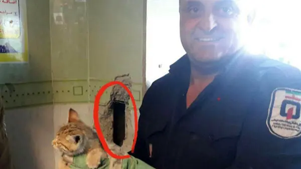 گیر کردن عجیب گربه بازیگوش در دیوار یکی از بیمارستان بوکان +عکس عملیات نجات