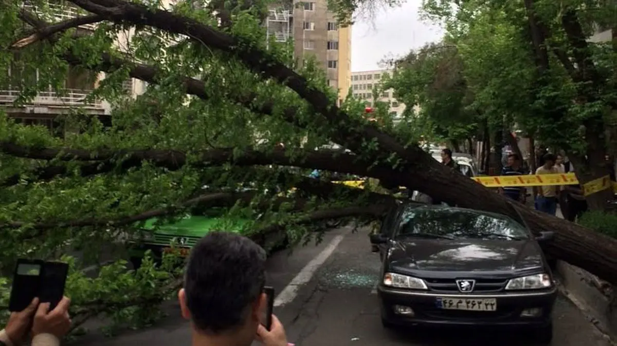 سقوط درخت پیر روی ۳ خودرو در خیابان کریمخان تهران