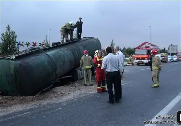 واژگونی تانکر حامل 20 تن مواد شیمیایی خطرناک در آزادراه قزوین-کرج+عکس