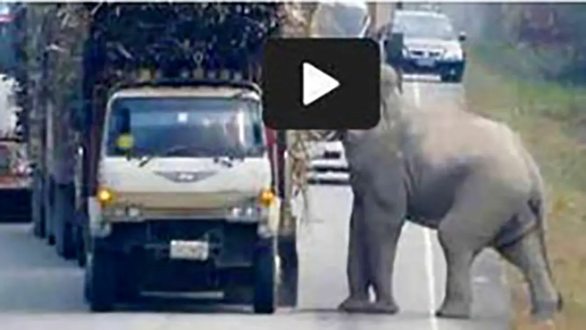 رکنا: فیل گرسنه در تایلند با بستن مسیر حرکت کامیونها دنبال غذا میگشت.