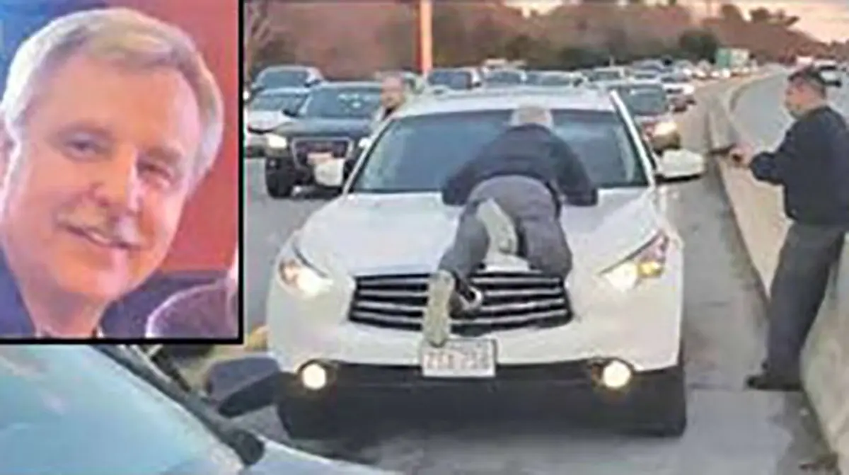 «ریچارد کامروسکی» 65 ساله پس از تصادف خودرواش با خودروی «مارک فیتز» 37 ساله به حدی عصبانی شده که خودش را روی خودرو پرتاب کرد و راننده هم بی توجه به رفتار او با سرعت 70 مایل بر ساعت حرکت کرده است که باعث تعجب رانندگان دیگر شد.