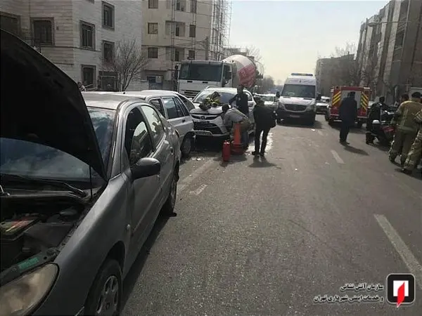 به گفته مهدی راهپیما فرمانده ایستگاه 77 آتش نشانی، درجریان یک حادثه رانندگی تعداد پنج دستگاه خودرو سواری شامل دو خودرو پراید و سه خودروی سواری تیبا، پژو 206 و جک شاسی بلند به دلیل نامشخصی با یکدیگر تصادف کردند.