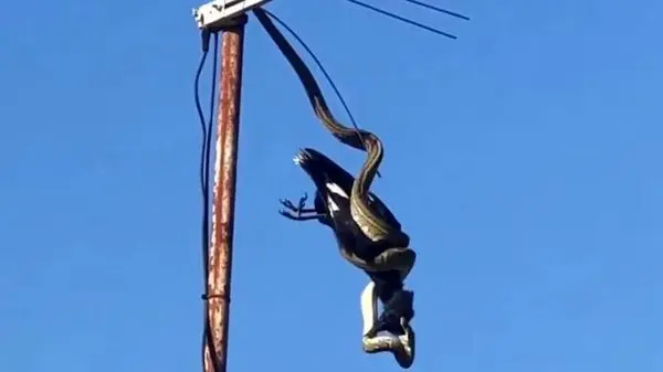 او در منطقهای ساکن است که روزانه مارهای زیادی را میبیند، اما اینگونه شکار را هرگز در زندگیاش ندیده بود. کتی متوجه شد که آنتن تلویزیونش که روی پشت بام قرار داشت، بهم خورده است، بنابراین پس از پیگیری، با شکار وحشتناک مار روی پشتبام خانهاش مواجه شد. گویا کلاغ نگونبخت بیخبر از همه جا روی آنتن تلویزیون نشسته بود و مار هم بدون حرکت به پایه آنتن چسبیده بود، به طوری که تصور میشد یک کابل برق است و نه یک موجود زنده. مار در ابتدا کلاغ را میکشد و پس از آن از ناحیه سر، این حیوان بیچاره را میگیرد و به سمت بالا میکشد.برای ورود به کانال تلگرام ما کلیک کنید.