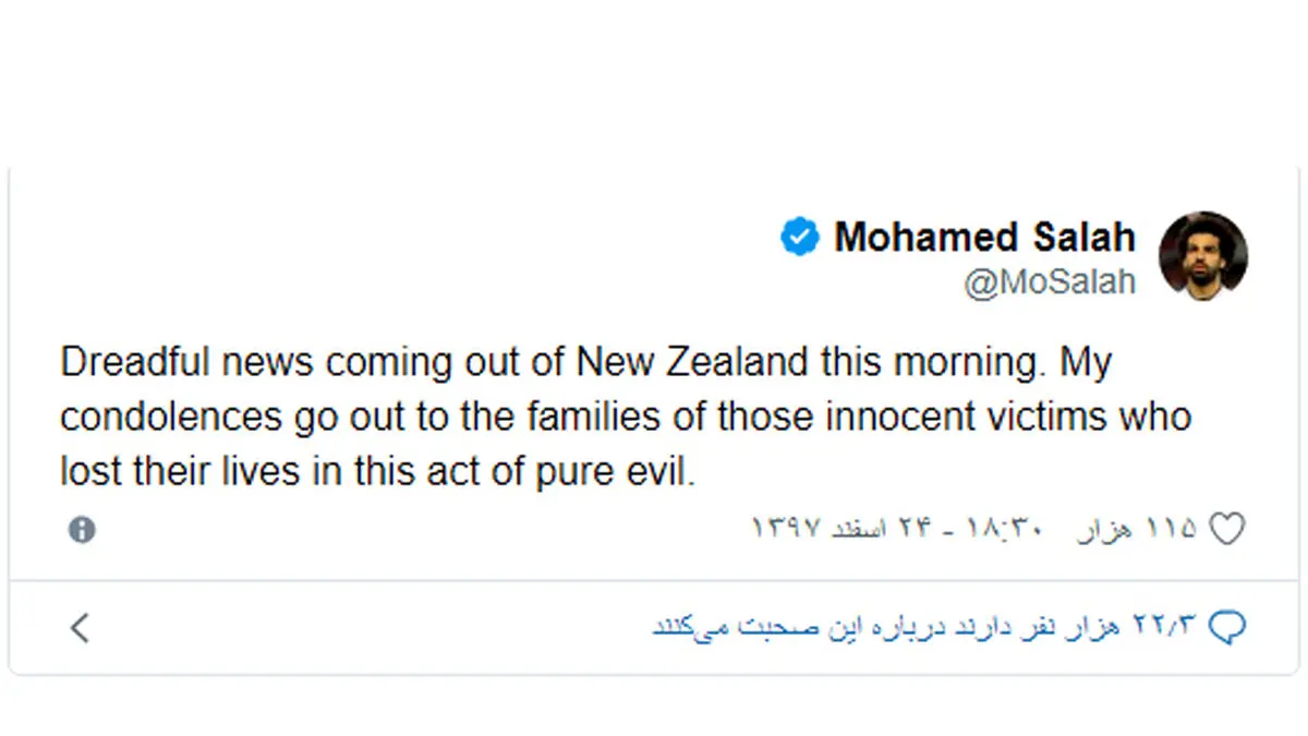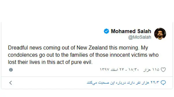 صلاح در حساب توئیتری خود نوشت: امروز صبح خبرهای وحشتناکی از نیوزلند منتشر شد. من به خانواده قربانیان بیگناه که جانشان را در این اقدام کاملاً شیطانی از دست دادند تسلیت میگویم.