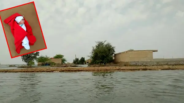 کاظم کعبی، پدر "سارا" درباره به دنیا آمدن فرزندش می‌گوید که چهار روز پیش بود که درد زایمان همسرم فرا رسید. آب تمام روستا را گرفته بود و اگر می خواستیم به بیمارستان برسیم باید با قایق خود را به بیمارستان سوسنگرد می رساندیم. اما شرایط استفاده از قایق برای همسرم وجود نداشت.