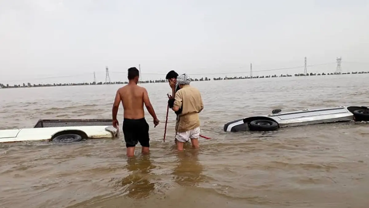 حوادث رکنا: جاده اهواز به شادگان، بر اثر بالا آمدن آب بطور کلی به زیر آب رفت.