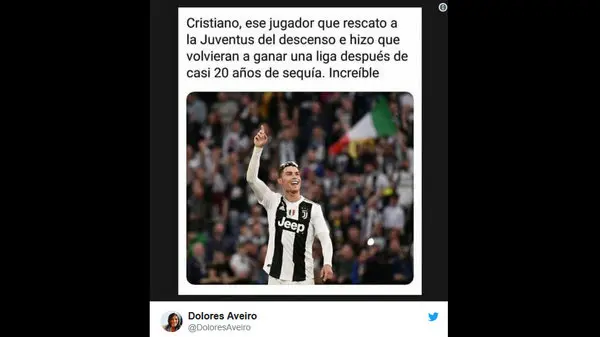 جملاتی که مادر رونالدو در توییت خود پست کرده بود حکایت از آن دارد که تیم یوونتوس 20 سال است قهرمان سری آ ایتالیا نشده و تا قبل از حضور رونالدو غرق در بحران بود و حالا به لطف پسر او موفق به کسب این افتخار شده است. در این توئیت عکس کریس رونالدو در حال شادی به همراه متن زیر منتشر شده است: