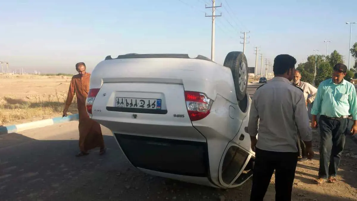 حوادث رکنا: خودروی ساینا به خاطر سرعت بالا در اتوبان خرمشهر به آبادان واژگون شد.