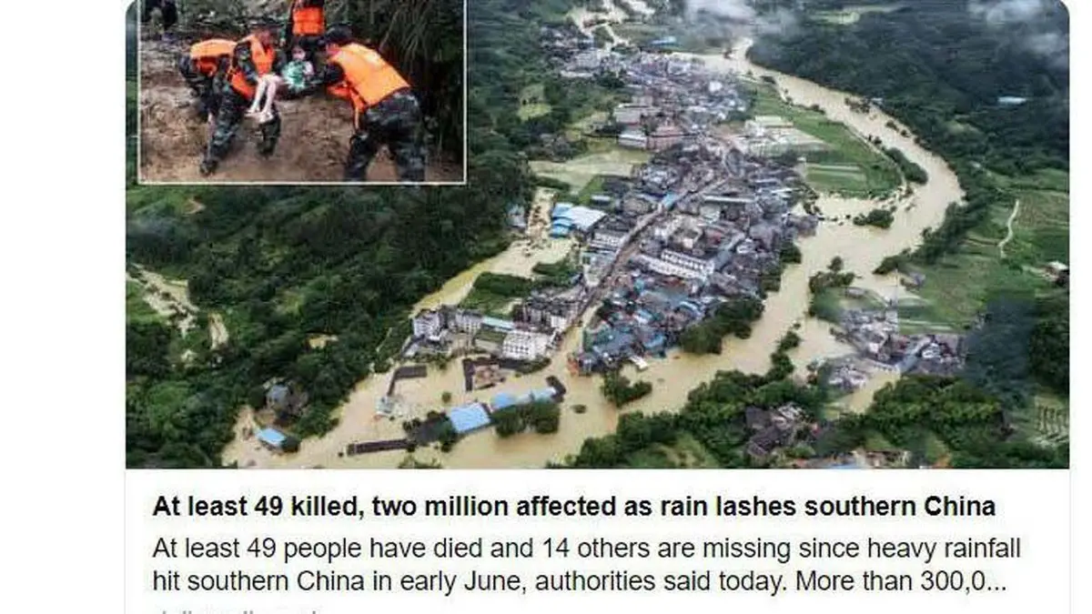 کمیته ستاد بحران چین اعلام کرد بارشهای ابتدای ژوئن تاکنون باعث تخریب 7 هزار خانه شده و 300 هزار نفر مجبور به ترک خانههای خود شدهاند.
