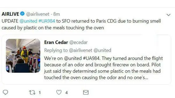 مقامات فرودگاهی اعلام کردند پس از درخواست فرود اضطراری پرواز 984 یونایتد ایرلاینز در فرودگاه پاریس، معلوم شد بوی سوختگی در هواپیما به دلیل چسبیدن ظرف پلاستیکی غذا بوده است.برای ورود به کانال تلگرام ما کلیک کنید.