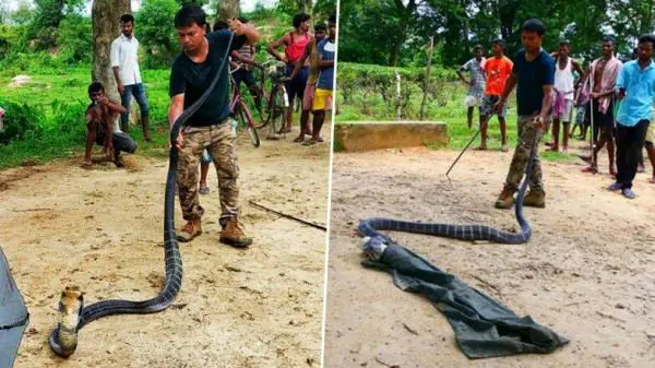 در تصویری که منتشر شده نشان می دهد که مارگیر شاه کبری را به دام انداخته و سعی دارد با گرفتن دم حیوان او را تحت کنترل خود در بیاورد سرانجام این مارگیر با کمک یک چتر توانست این مار را بگیرد و به یک منطقه جنگلی منتقل کند.برای ورود به کانال تلگرام ما کلیک کنید.