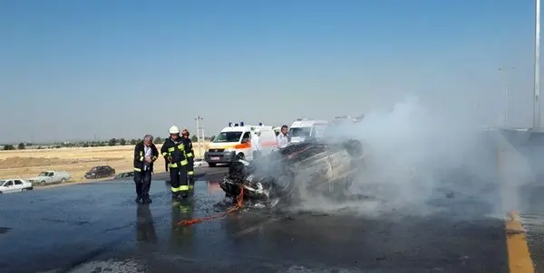 لحظاتی پس از چپ کردن پراید با 4 سرنشین وسط اتوبان قزوین کرج + فیلم و عکس