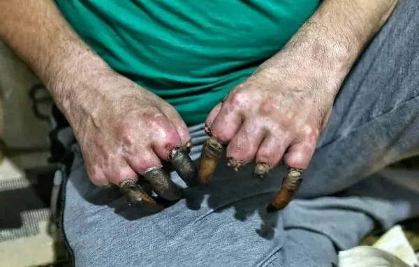 حوادث رکنا: این عکس دستان کولبری به نام احمد است که پارسال در برف گیر کرد و دستاش به خاطر سرما به این روز افتاد و حالا بعد از چند ماه انگشتاش دارد یکی یکی میافتد.