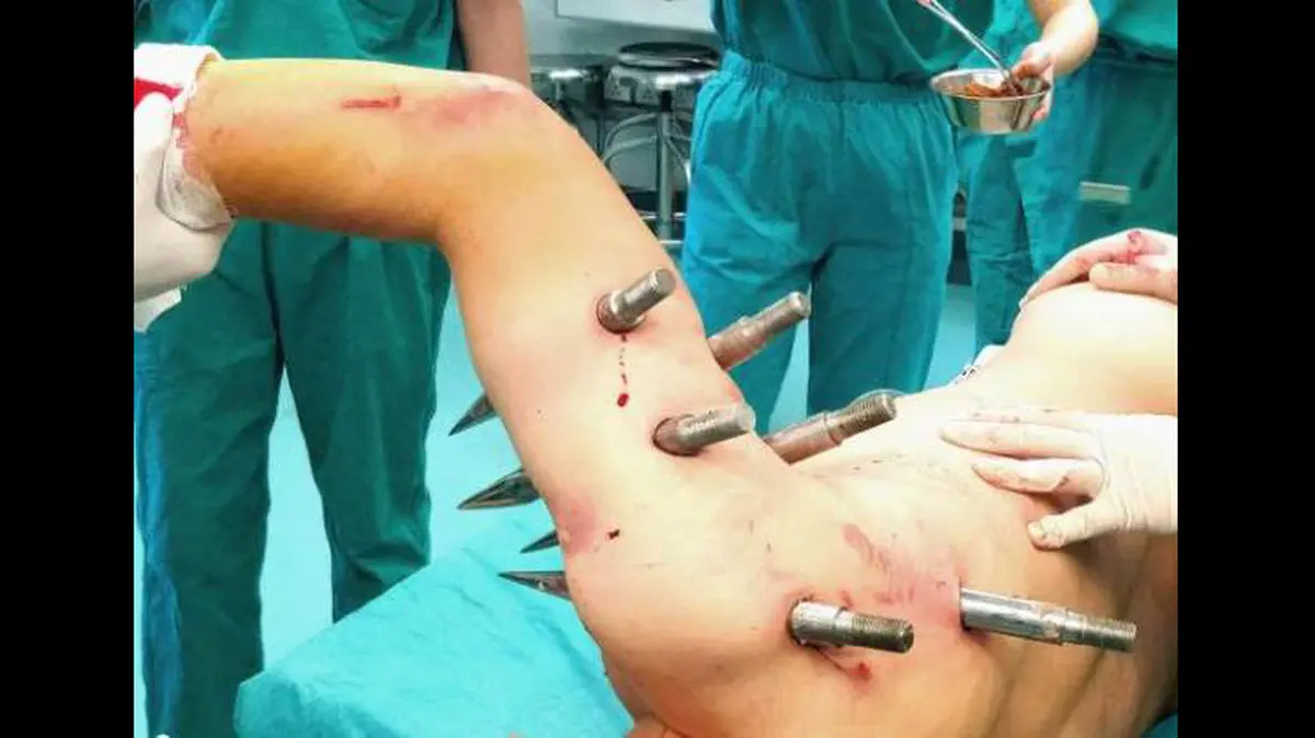 واقعا شوکه کننده است و حتی تصور چنین چیزی هم می تواند باعث آزار شود! با این حال تیم پزشکان بعد از وارد شدن آقای ژو به بیمارستان و انجام برخی بررسی ها، فورا تصمیم به جراحی و خارج کردن این میخ های فولادی گرفتند. جالب است بدانید که در حین جراحی پزشکان دریافتند که یکی از میله ها به میزان 0.1 میلی متر با شریان اصلی او فاصله داشت!