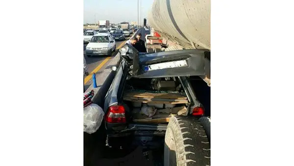 پراید بین چرخهای تریلی پرس شد / باورتان می شود راننده زنده ماند+عکس
