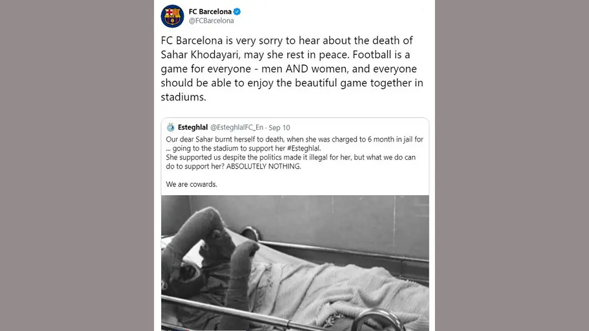 باشگاه بارسلونا خیلی از شنیدن خبر مرگ سحر خدایاری متأسف است، امیدوارم او در آرامش باشد. فوتبال یک بازی برای همه است، مردان و زنان و همه باید قادر باشند از این بازی زیبا در استادیوم‌ها کنار هم لذت ببرند.