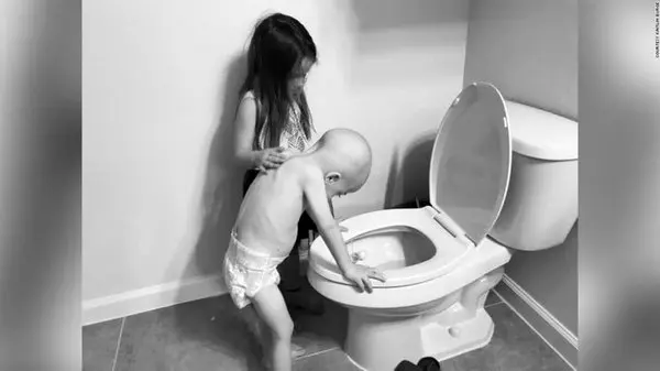 در تصویری که به تازگی در شبکه های اجتماعی منتشر شده یک کودک ۴ ساله به نام پاکت که از بیماری سرطان رنج میبرد به دستشویی رفته و خواهر بزرگترش اوبری، که تنها یک سال از او بزرگتر است، مهربانانه و مادرانه در کنار ایستاده است.