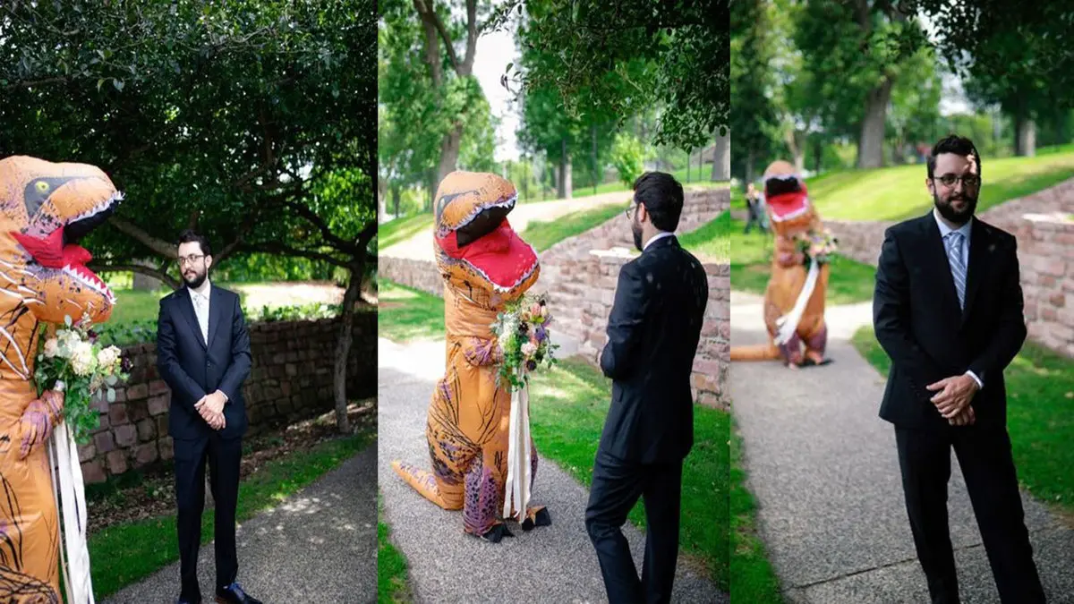 عکاسان حاضر در صحنه از لحظه تعجب و حیرت داماد زمانی که عروسش را در لباس دایناسور دید تا خنده های او از این غافلگیری عکسبرداری کرده و در فضای مجازی انتشار دادند.