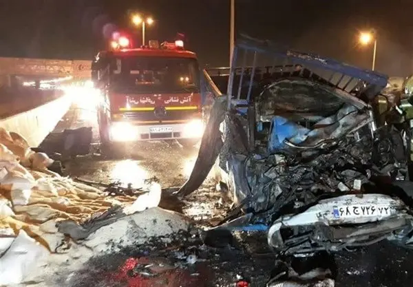 ملکی افزود: بلافاصله دو ایستگاه اتشنشانی به محل اعزام شده ودر محل حادثه مشاهده کردند دو دستگاه خودرو شامل یک دستگاه نیسان باری حامل بار برنج که احتمالا از شهرهای شمالی کشور در حرکت بوده با دو نفر سرنشین و یک دستگاه خودرو شاسی بلند نیسان سرانزا به شدت با هم برخورد کردهاند و خودروی نیسان باری به حالت نیمه واژگون درآمده و هر دو دستگاه خودرو کاملا شعله ور بودند.